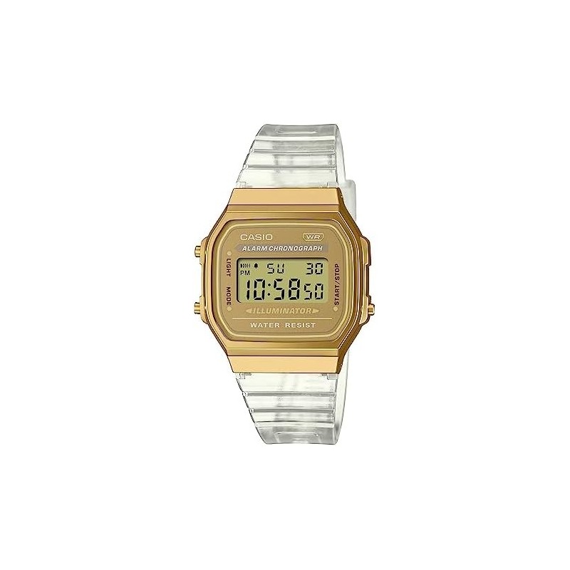A168XESG-9AVT Unisex Vintage Transparent Band Gold Tone Alarm Chronograph Illuminator Digital Watch