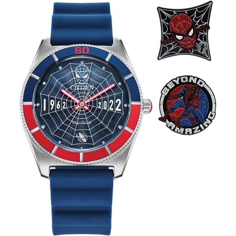 Eco-Drive Men's Marvel Limited Edition 60th Anniversary Spider Man Watch and Pin Gift Set, Stainless Steel with Blue Polyurethane Strap, 3-Hand, Luminous, 43mm (Model: AW2050-49W)