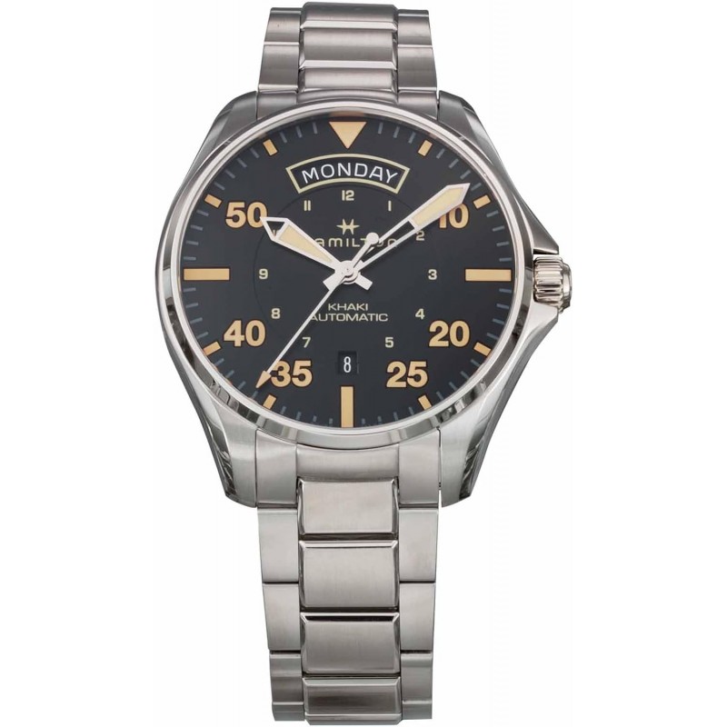 H64645131 Men's H64645131 Pilot Day Date Auto Khaki Aviation Black Dial Stainless Steel Sapphire Glass Automatic 1.7 inches (42 mm) Swiss Brand Watch Watch, Black, Bracelet Type