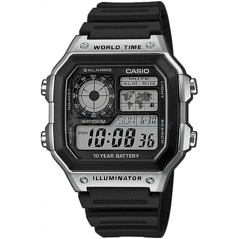 This Casio AE-1200WH-1CVEF watch, oriented for men, has a silicone case, with a square shape and black color. The strap is made of black silicone, and the bezel is silver. The glass is acrylic, the movement is quartz, and the display is digital. It can be submerged up to 10 M. Its functions include the following: alarm, calendar and stopwatch. It has a sporty style. Diameter: 45mm