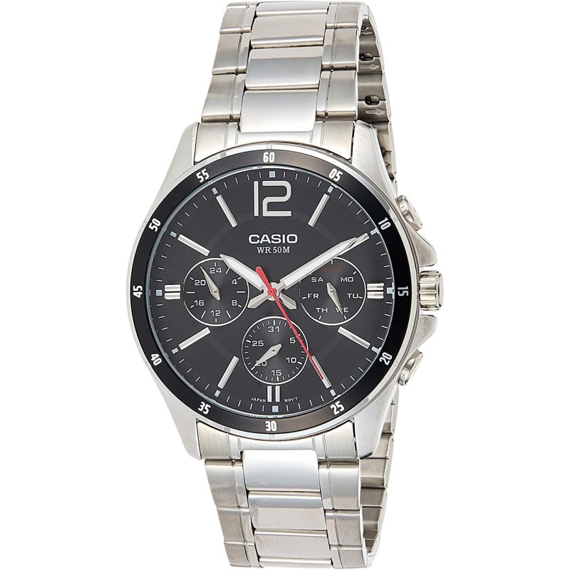 The Core by Casio is a timeless piece for those who value the little luxuries in life. This watch is handmade with a sleek metal band and metal case. These durable materials guarantee longevity of the product and a proud owner in the years to come. The silver band, black dial and silver hands contribute to the overall appearance of the watch by adding a sophisticated aspect. This piece also features a sturdy mineral crystal to protect the dial and a Japanese quartz movement to ensure you remain punctual in your daily life. In addition, this product is water-resistant to 50 metres / 165 feet / 5 atm, which is ideal for those days where an accident may occur. The rich details, imperishable components and luxurious quality of the Casio Core watch make it a perfect addition to any collection.