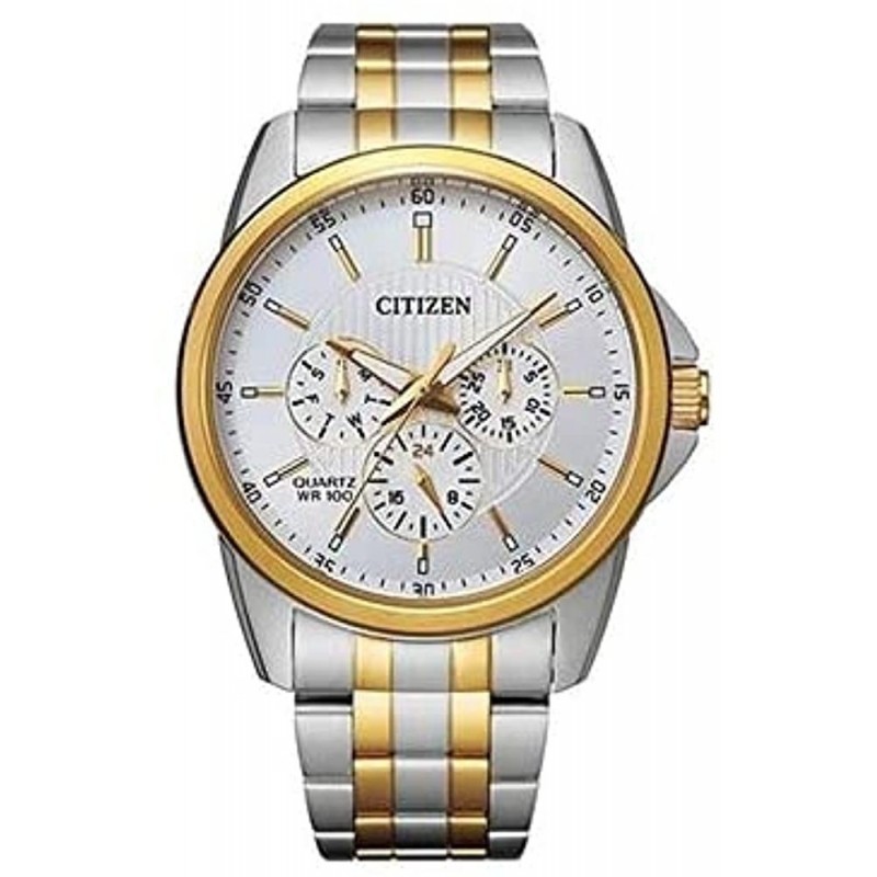 Silver dial enhanced by luminous gold-tone hands. stainless steel case with a two-tone (silver-tone and gold-tone) stainless steel band. Quartz movement. 100 meters / 330 feet water resistance. Fixed bezel. Scratch Resistant Mineral crystal. Solid caseback. Deployment clasp. Pull / Push crown. Case size 42 mm x 11 mm. Band 22 mm x long. Citizen AG8344-57B Watch.