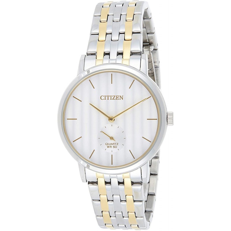 Silver dial enhanced by gold-tone hands. Silver-tone stainless steel case with a two-tone (silver-tone and gold-tone) stainless steel band. Quartz movement. 50 meters / 165 feet water resistance. Fixed bezel. Scratch Resistant Mineral crystal. Solid caseback. Fold Over with Push Button Release clasp. Pull / Push crown. Case size 39 mm x 9.8 mm. Band 20 mm x long. Citizen BE9174-55A Watch.