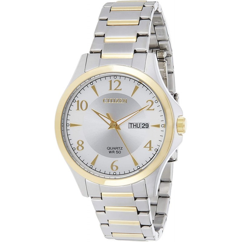 Silver dial enhanced by luminous gold-tone hands. Silver-tone stainless steel case with a two-tone (silver-tone and gold-tone) stainless steel band. Quartz movement. 50 meters / 165 feet water resistance. Fixed bezel. Scratch Resistant Mineral crystal. Solid caseback. Fold Over with Push Button Release clasp. Pull / Push crown. Case size 41 mm x 9 mm. Band 21 mm x long. Citizen BF2005-54A Watch.