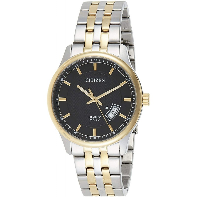 Black dial enhanced by luminous gold-tone hands. Silver-tone stainless steel case with a two-tone (silver-tone and gold-tone) stainless steel band. Quartz movement. 50 meters / 165 feet water resistance. Fixed bezel. Scratch Resistant Mineral crystal. Solid caseback. Fold Over with Push Button Release clasp. Pull / Push crown. Case size 40 mm x 9 mm. Band 20 mm x long. Citizen BI1054-80E Watch.