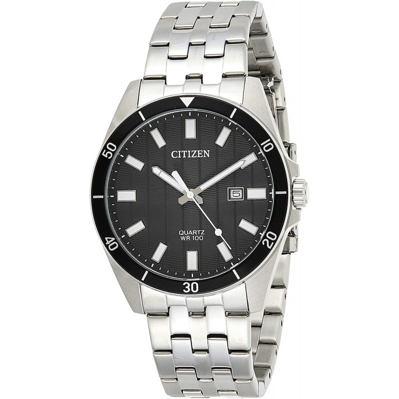 Black dial enhanced by luminous silver-tone hands. Silver-tone stainless steel case with a silver-tone stainless steel band. Quartz movement. 100 meters / 330 feet water resistance. Fixed bezel. Scratch Resistant Mineral crystal. Solid caseback. Fold Over with Push Button Release clasp. Pull / Push crown. Case size 42 mm x 10 mm. Band 22 mm x long. Citizen BI5050-54E Watch.