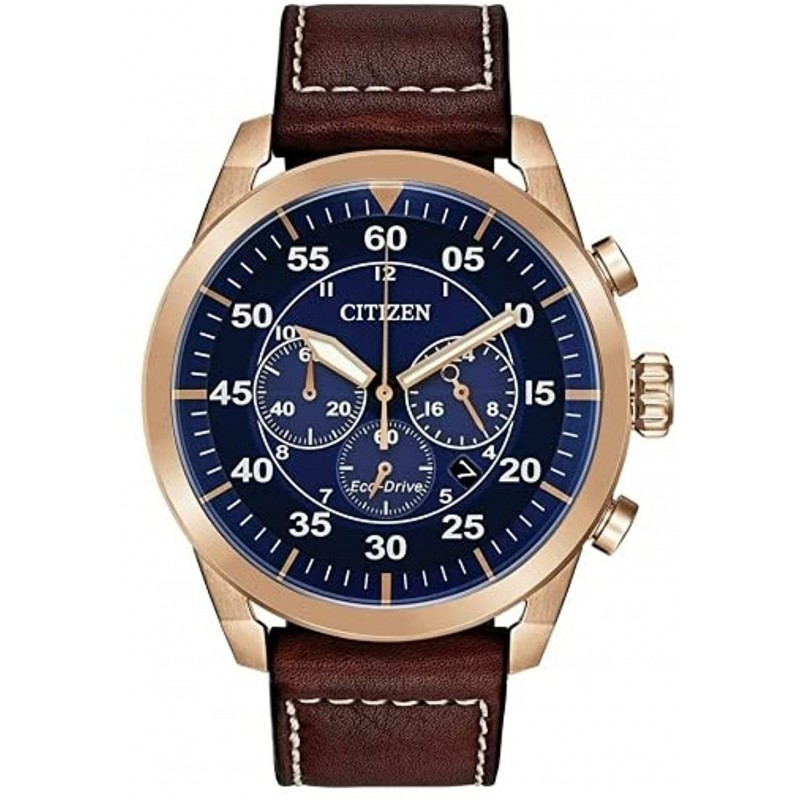 Blue dial enhanced by rose gold-tone hands. Rose Gold-tone stainless steel case with a brown leather band. Eco-Drive movement. 100 meters / 330 feet water resistance. Fixed bezel. Scratch Resistant Mineral crystal. Solid caseback. Tang clasp. Pull / Push crown. Case size 45 mm x 13 mm. Band 21 mm x long. Citizen CA4213-26L Watch.