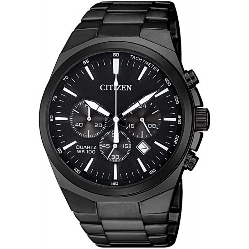 Black dial enhanced by black hands. Black-plated stainless steel case with a black-plated stainless steel band. Quartz movement. 100 meters / 330 feet water resistance. Fixed bezel. Scratch Resistant Mineral crystal. Solid caseback. Fold Over with Push Button Release clasp. Pull / Push crown. Case size 40 mm x 12.5 mm. Band 20 mm x long. Citizen AN8175-55E Watch.