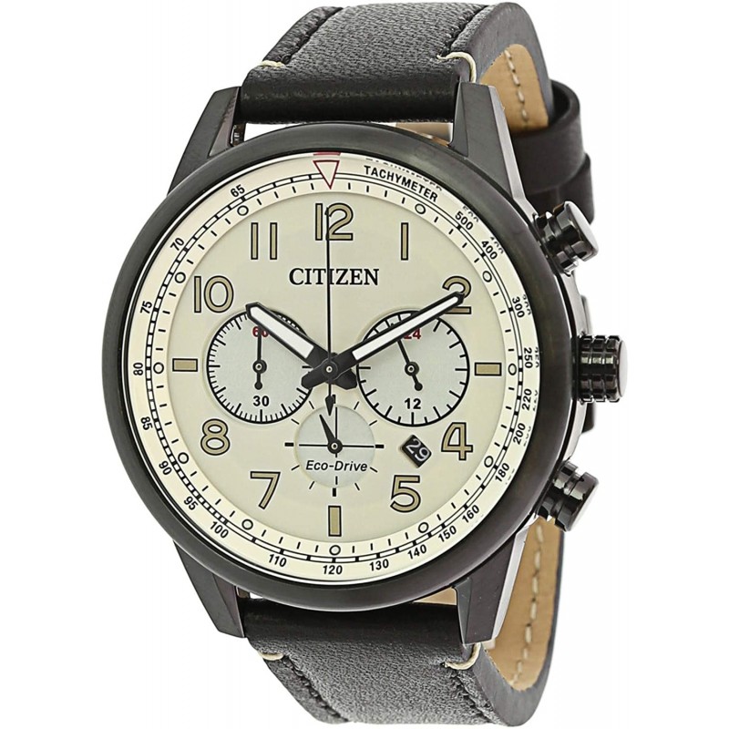 Beige dial enhanced by luminous black hands. Black-plated stainless steel case with a black-plated stainless steel band. Eco-Drive movement. 100 meters / 330 feet water resistance. Fixed bezel. Scratch Resistant Mineral crystal. Solid caseback. Fold Over with Push Button Release clasp. Pull / Push crown. Case size 43 mm x 13 mm. Band 20 mm x long. Citizen CA4425-10X Watch.