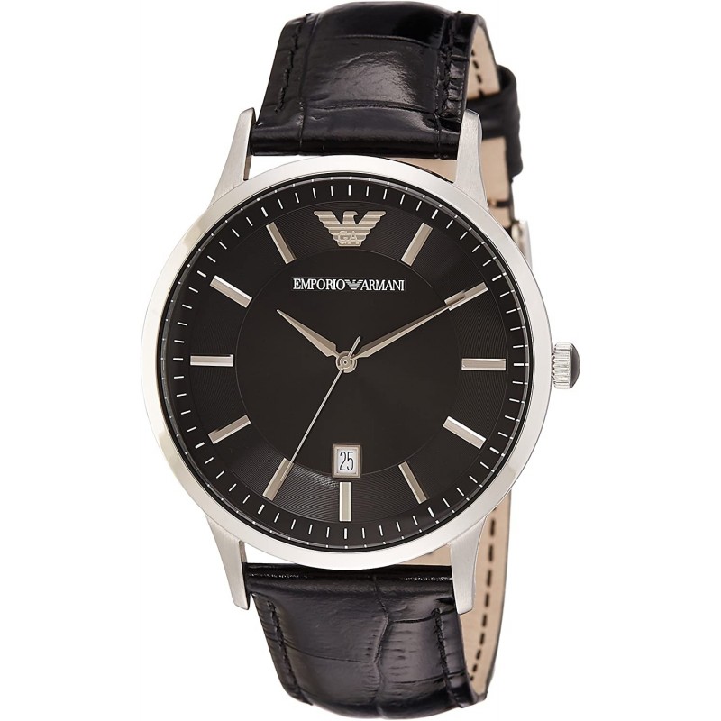 EMPORIO ARMANI mens watch, 43 MM stainless steel SILVER case, BLACK dial, LEATHER BLACK bracelet, 5 ATM (160 feet / 50 metri) of water resistance. Brand new and delivered with manufacturer warranty and genuine EMPORIO ARMANI presentation box.