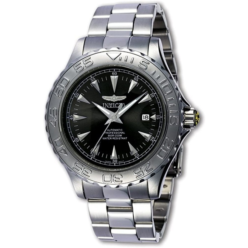 Rugged performance and bold masculine style combine in the Ocean Ghost ProDiver II automatic watch from Invicta. The large solid steel case frames a black dial with three silvertone hands, applied silvertone indices, and a date display at the three o'clock position. Tritnite luminous hands and markers make the dial readable even in the dark. The dial is capped with a resilient anti-reflective mineral crystal and framed by a unidirectional rotating steel bezel, for safe timing of dives and other limited events. This well-built watch is shock resistant and features a screw-down crown and case back for water resistance to a full 200 meters. An automatic 21 jewel movement, visible through the skeleton case back, powers the watch and never requires a battery change. The watch is presented on a handsome and durable triple link steel bracelet.