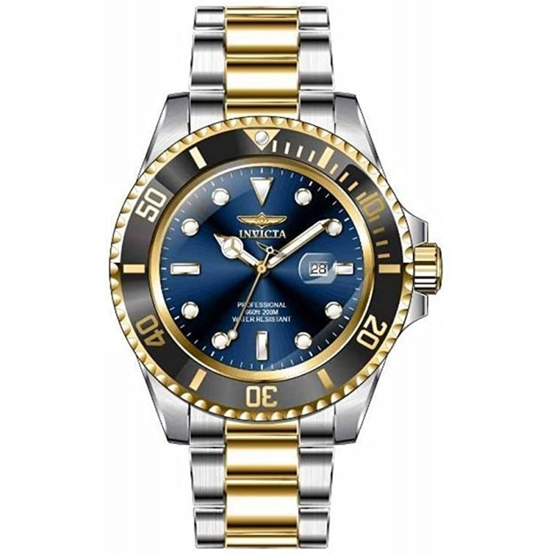 Dial azul mejorado por manos luminosas de tono de oro. Funda de acero inoxidable de tono plateado con una banda de acero inoxidable de dos tonos (tonos plateados y dorado). Movimiento de cuarzo. 100 metros / 330 pies de resistencia al agua. Bisel giratorio unidireccional. Cristal de fusión de llama. CaseBack sólido. Doblar sobre cierre. Tirar / empujar corona. Tamaño de la caja 54 mm x 15 mm. Banda 26 mm x 8.25 pulgadasLong. Invicta 36077 Pro Diver Watch.