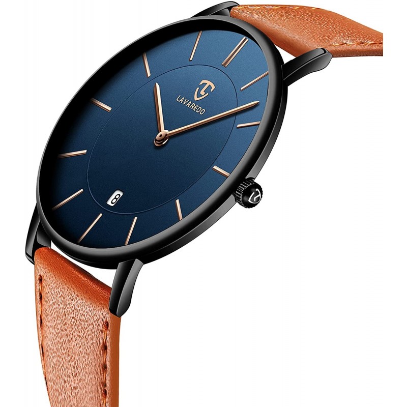 Watch L6628-OrangeBlue-P , Men Minimalist Fashion Simple Wrist Analog Date with Leather Strap Orange Blue