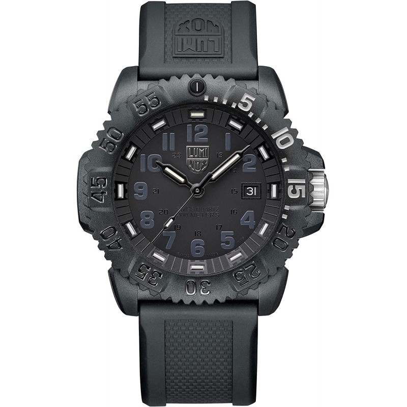 The 3051.GO.NSF military watch was designed in collaboration with the Navy SEAL Foundation (NSF) and bears their logo on the case back.In terms of color tone-on-tone, the monochrome Luminox logo on the dial catches the eye. The design of the Navy SEAL series impresses with its distinctive "turtle shape".Thanks to its protected crown and diver's bezel, it is also water-resistant up to 200 meters. The tried-and-tested Luminox lighting system also ensures that the time can be read easily in every situation, and without any additional energy supply.SPECIFICATIONSOrigin: Swiss Made Always Visible: Permanent glow for up to 25 years Case diameter: 44 mm Function: time / date Water resistance (meters, feet, ATM): 200/660/20 Movement Swiss Quartz Housing material : CARBONOX Bezel: unidirectional Caseback: 316L stainless steel screwed on Glass: Hardened mineral glass (550-650 Vickers) Crown: double seal and crown protection Strap: rubber Strap width: 23 mm Height: 14mm Weight: 64 g