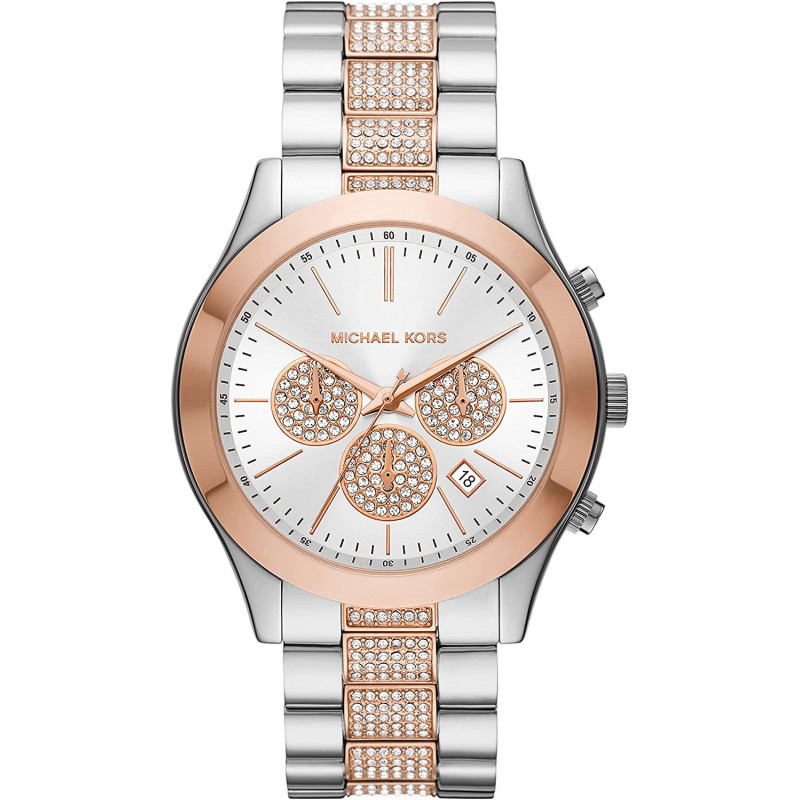 Michael Kors' 44mm Slim Runway watch features a silver dial with pavé sub eyes, silver case with rose gold-tone topring, chronograph movement and two-tone stainless steel bracelet with pavé center links.