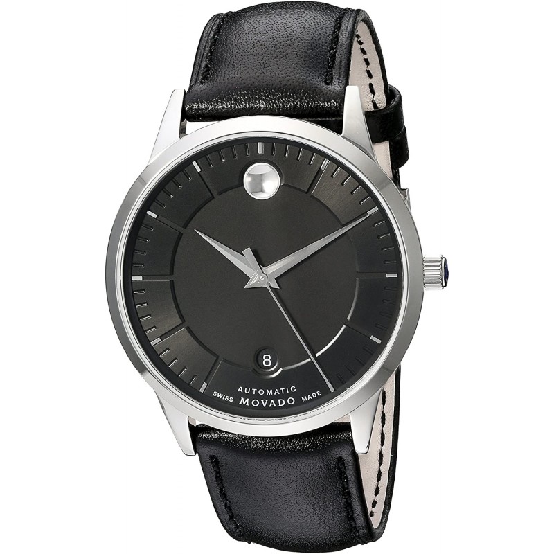 Men's Modern Automatic watch, 39.5 mm stainless steel case with exhibition back, round bi-level black soleil 3-hand dial with silver-toned signature dot and hands, recessed stick hour markers with applied silver-toned accents, recessed minute index, round date display, black leather strap with stainless steel classic tongue buckle, sapphire crystal, Swiss automatic movement, water resistant to 30 meters.