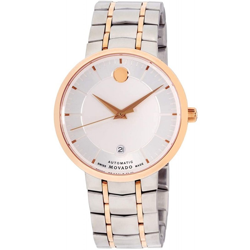 Silver dial enhanced by rose gold-tone dauphine-style hands. Silver-tone stainless steel case with a two-tone (silver-tone and rose gold pvd) stainless steel band. Automatic movement. 30 meters / 100 feet water resistance. Fixed bezel. Scratch Resistant Sapphire crystal. Transparent caseback. Deployment with Push Button Release clasp. Pull / Push crown. Case size 39.5 mm x 9 mm. Band 20 mm x long. Movado 0607063 1881 Watch.