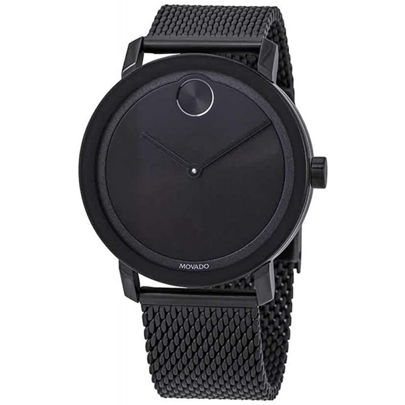 Black dial enhanced by black hands. Black Ion-plated stainless steel case with a black ion-plated stainless steel mesh band. Quartz movement. 30 meters / 100 feet water resistance. Fixed bezel. Scratch Resistant K1 crystal. Solid caseback. Fold Over Slip Through clasp. Pull / Push crown. Case size 40 mm. Band 20 mm x long. Movado 3600562 Bold Watch.