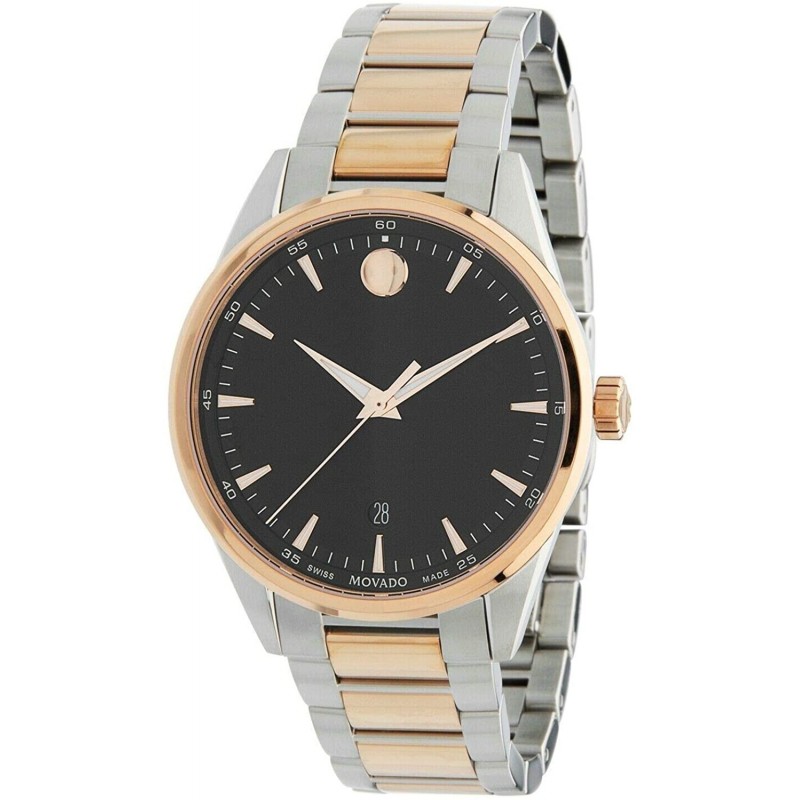 Black dial enhanced by luminous rose gold-tone hands. Silver-tone stainless steel case with a two-tone (silver-tone and rose gold pvd ) stainless steel band. Quartz movement. 30 meters / 100 feet water resistance. Fixed bezel. Scratch Resistant Sapphire crystal. Solid caseback. Butterfly clasp. Screw Down crown. Case size 40 mm. Band 20 mm x long. Movado 0607359 Watch.
