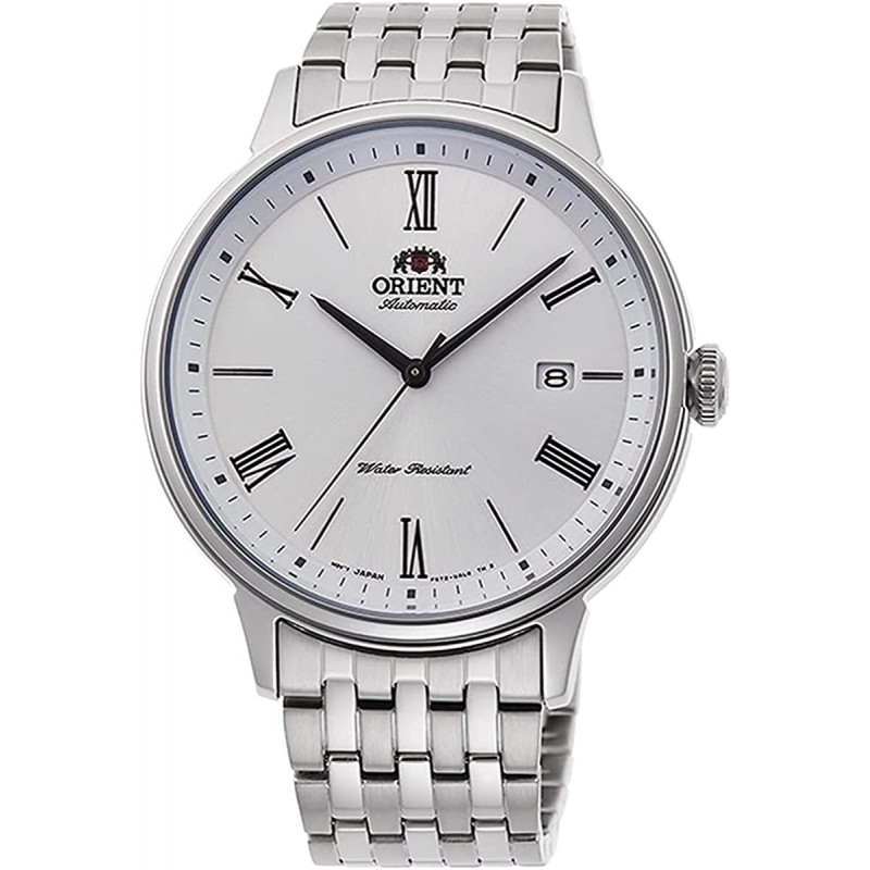 Silver-tone dial enhanced by silver-tone hands. Silver-tone stainless steel case with a silver-tone stainless steel band. Automatic movement. 50 meters / 165 feet water resistance. Fixed bezel. Scratch Resistant Hardlex crystal. Solid caseback. Fold Over with Double Push Button Release clasp. Pull / Push crown. Case size 42 mm x 12 mm. Band 20 mm x long. Orient RA-AC0J04S10B Classic Watch.