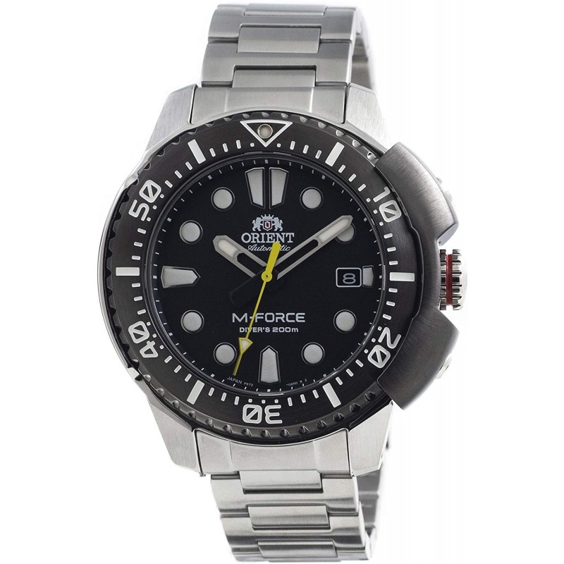 Black dial enhanced by luminous silver-tone hands. Silver-tone stainless steel case with a silver-tone stainless steel band. Automatic movement. 200 meters / 660 feet water resistance. Uni-directional Rotating bezel. Scratch Resistant Sapphire crystal. Solid caseback. Fold Over with Double Push Button Release clasp. Screw Down crown. Case size 45 mm x 13.2 mm. Band 20 mm x long. Orient RA-AC0L01B00B M-Force Watch.