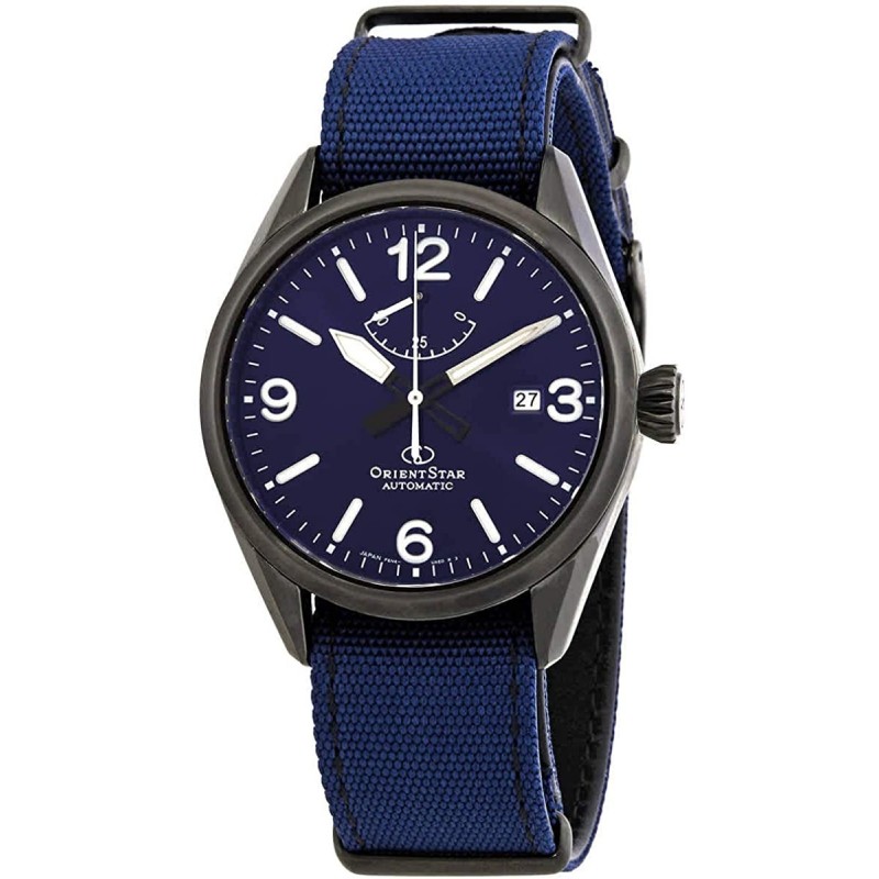 Blue dial enhanced by luminous silver-tone hands. Black-plated stainless steel case with a blue nylon band. Automatic movement. 100 meters / 330 feet water resistance. Fixed bezel. Scratch Resistant Hardlex crystal. Transparent caseback. Deployment with Push Button Release clasp. Screw Down crown. Case size 41 mm x 12 mm. Band 20 mm x long. Orient RE-AU0207L00B Star Watch.