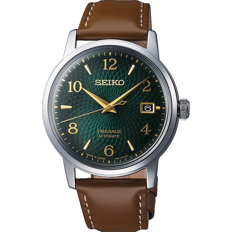 Green dial enhanced by gold-tone dauphine-style hands. Silver-tone stainless steel case with a brown leather band. Automatic movement. 50 meters / 165 feet water resistance. Fixed bezel. Scratch Resistant Hardlex crystal. Transparent caseback. Tang clasp. Pull / Push crown. Case size 38.5 mm x 11.8 mm. Band 22 mm x long. Seiko SRPE45J1 Presage Watch.